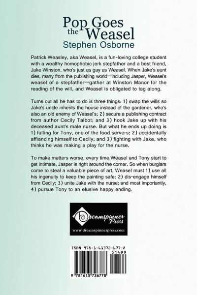 Patrick Weasley, aka Weasel, is a fun-loving college student with a wealthy homophobic jerk stepfather and a best friend, Jake Winston, who's just as gay as Weasel. When Jake's aunt dies, many from the publishing world-including Jasper, Weasel's weasel of a stepfather-gather at Winston Manor for the reading of the will, and Weasel is obligated to tag along. Turns out all he has to do is three things: 1) swap the wills so Jake's uncle inherits the house instead of the gardener, who's also an old enemy of Weasel's; 2) secure a publishing contract from author Cecily Talbot; and 3) hook Jake up with his deceased aunt's male nurse. But what he ends up doing is 1) falling for Tony, one of the food servers; 2) accidentally affiancing himself to Cecily; and 3) fighting with Jake, who thinks he was making a play for the nurse. To make matters worse, every time Weasel and Tony start to get intimate, Jasper is right around the corner. So when burglars come to steal a valuable piece of art, Weasel must 1) use all his ingenuity to keep the painting safe; 2) dis-engage himself from Cecily; 3) unite Jake with the nurse; and most importantly, 4) pursue Tony to an elusive happy ending.