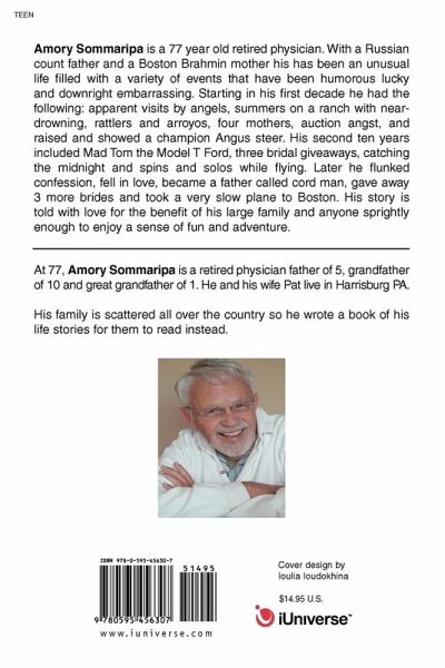 Amory Sommaripa is a 77 year old retired physician. With a Russian count father and a Boston Brahmin mother his has been an unusual life filled with a variety of events that have been humorous lucky and downright embarrassing. Starting in his first decade he had the following: apparent visits by angels, summers on a ranch with near-drowning, rattlers and arroyos, four mothers, auction angst, and raised and showed a champion Angus steer. His second ten years included Mad Tom the Model T Ford, three bridal giveaways, catching the midnight and spins and solos while flying. Later he flunked confession, fell in love, became a father called cord man, gave away 3 more brides and took a very slow plane to Boston. His story is told with love for the benefit of his large family and anyone sprightly enough to enjoy a sense of fun and adventure.