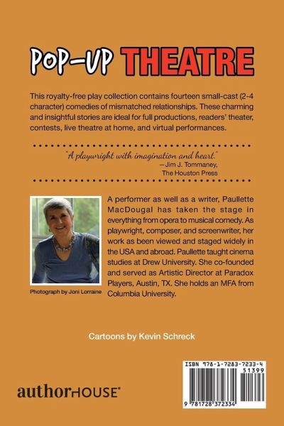 POP-UP THEATRE This royalty-free play collection contains fourteen small-cast (2-4 character) comedies of mismatched relationships. These charming and insightful stories are ideal for full productions, readers' theater, contests, live theatre at home, and virtual performances.
