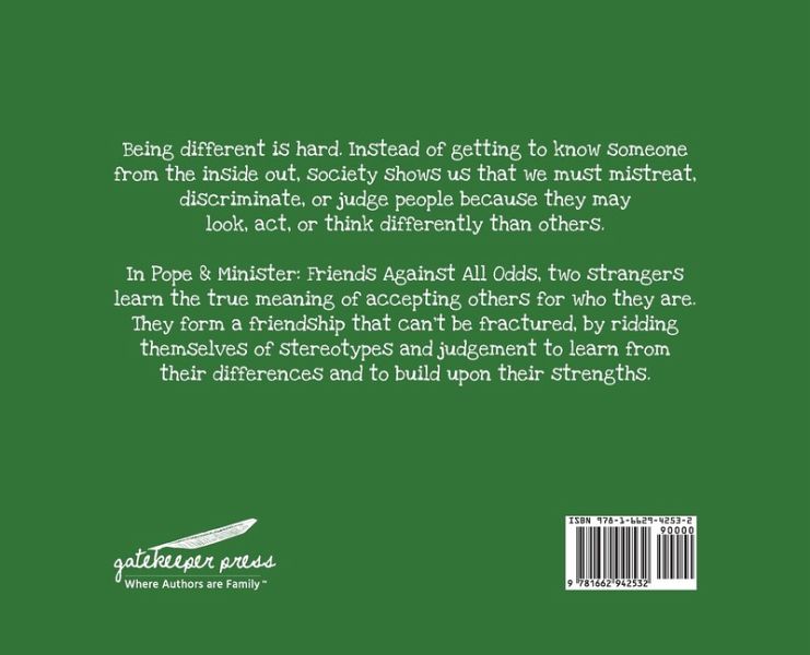 Being different is hard. Instead of getting to know someone from the inside out, society shows us that we must mistreat, discriminate, judge, or stereotype people because they may look, act, or think differently than someone else. In Pope & Minister: Friends Against all odds, two strangers learn the true meaning of accepting others for who they are. They form a friendship that can't be broken. They rid themselves of stereotypes and judgement to learn from their differences and to build upon their strengths.