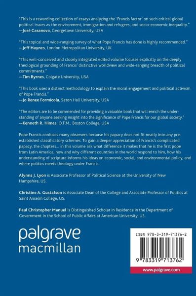 Pope Francis confuses many observers because his papacy does not fit neatly into any pre-established classificatory schemes. To gain a deeper appreciation of Francis's complicated papacy, this volume proposes that an interdisciplinary approach, fusing concepts derived from moral theology and the social sciences, may properly situate Pope Francis as a global political entrepreneur. The chapters in this volume ask what difference it makes that he is the first pope from Latin America, how and why different countries in the world respond to him, how his understanding of scripture informs his ideas on economic, social, and environmental policy, and where politics meets theology under Francis. In the end, this volume seeks to provide a more robust understanding of the enigmatic papacy of Francis.