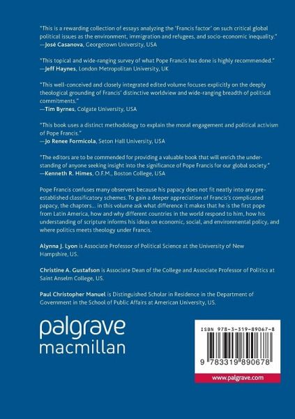 Pope Francis confuses many observers because his papacy does not fit neatly into any pre-established classificatory schemes. To gain a deeper appreciation of Francis's complicated papacy, this volume proposes that an interdisciplinary approach, fusing concepts derived from moral theology and the social sciences, may properly situate Pope Francis as a global political entrepreneur. The chapters in this volume ask what difference it makes that he is the first pope from Latin America, how and why different countries in the world respond to him, how his understanding of scripture informs his ideas on economic, social, and environmental policy, and where politics meets theology under Francis. In the end, this volume seeks to provide a more robust understanding of the enigmatic papacy of Francis.