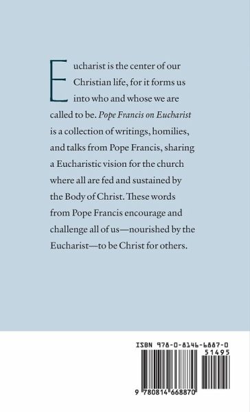 Eucharist is the center of our Christian life, for it forms us into who and whose we are called to be. Pope Francis on Eucharist is a collection of writings, homilies, and talks from Pope Francis, sharing a Eucharistic vision for the church where all are fed and sustained by the Body of Christ. These words from Pope Francis encourage and challenge all of us--nourished by the Eucharist--to be Christ for others.