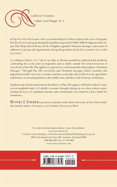In Pope Pius XII on the Economic Order, economist Rupert J. Ederer explores the views of Eugenio Pacelli, who served as pope during the tumultuous period of 1939 to 1958. Prodigious in his output, Pius XII produced 40 encyclicals, 19 highly regarded Christmas messages, and series of addresses to groups and organizations, laying the groundwork for the economic views of his successors. According to Ederer, it "is safe to say that no Roman pontiff has addressed the problems confronting the social order as frequently and as widely outside the formal structure of encyclicals as Pius XII. This applies in a special way to his masterful and prophetic Christmas Messages." Through the study of Pius XII's encyclicals and Christmas messages, Ederer examines this important pontiff's views on economics and the social order, the world of work, agriculture and farmers, food and population, the middle class, and the world of money and finance. Students and scholars interested in the history of Pius XII's papacy will find in Ederer's analysis an insightful study of Catholic economic thought during an era when nations representing the forces of capitalism, fascism, and Communism were joined in a fierce battle for dominance.