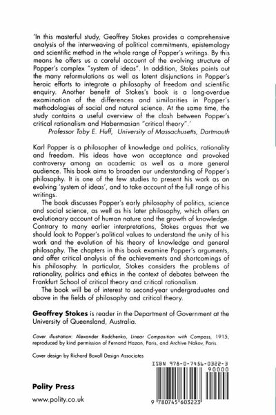 The book discusses Popper s early philosophy of politics, science and social science, as well as his later philosophy, which offers an evolutionary account of human nature and the growth of knowledge. Contrary to many earlier interpretations, Stokes argues that we should look to Popper s political values to understand the unity of his work and the evolution of his theory of knowledge and general philosophy. The chapters in this book examine Popper s arguments, and offer critical analysis of the achievements and shortcomings of his philosophy. In particular, Stokes considers the problems of rationality, politics and ethics in the context of debates between the Frankfurt School of critical theory and critical rationalism.