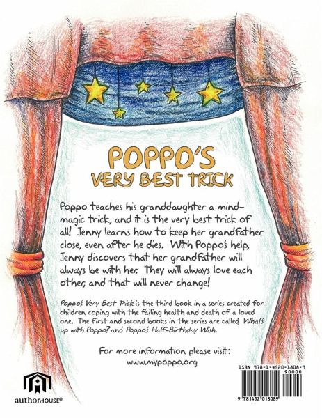 Poppo teaches his granddaughter a mind-magic trick, and it is his very best trick of all! Jenny learns how to keep her grandfather close, even after he dies. With Poppo's help, Jenny discovers that her grandfather will always be with her. They will always love each other, and that will never change! For more information please visit www.mypoppo.org.