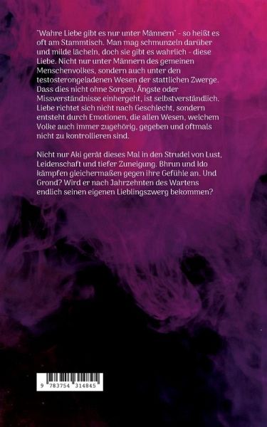 "Wahre Liebe gibt es nur unter Männern" - so heißt es oft am Stammtisch. Man mag schmunzeln darüber und milde lächeln, doch sie gibt es wahrlich - diese Liebe. Nicht nur unter Männern des gemeinen Menschenvolkes, sondern auch unter den testosterongeladenen Wesen der stattlichen Zwerge. Dass dies nicht ohne Sorgen, Ängste oder Missverständnisse einhergeht, ist selbstverständlich. Liebe richtet sich nicht nach Geschlecht, sondern entsteht durch Emotionen, die allen Wesen, welchem Volke auch immer zugehörig, gegeben und oftmals nicht zu kontrollieren sind.Nicht nur Aki gerät dieses Mal in den Strudel von Lust, Leidenschaft und tiefer Zuneigung. Bhrun und Ido kämpfen gleichermaßen gegen ihre Gefühle an. Und Grond? Wird er nach Jahrzehnten des Wartens endlich seinen eigenen Lieblingszwerg bekommen?