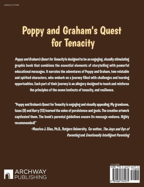 Poppy and Graham's Quest for Tenacity is designed to be an engaging, visually stimulating graphic book that combines the essential elements of storytelling with powerful educational messages. It narrates the adventures of Poppy and Graham, two relatable and spirited characters, who embark on a journey filled with challenges and learning opportunities. Each part of their journey is an allegory designed to teach and reinforce the principles of the seven instincts of tenacity, and resilience. "Poppy and Graham's Quest for Tenacity is engaging and visually appealing. My grandsons, Isaac (9) and Harry (13) learned the value of persistence and goals. The creative artwork captivated them. The book's parental guidelines ensure its message endures. Highly recommended!" -Maurice J. Elias, Ph.D., Rutgers University. Co-author, The Joys and Oys of Parenting and Emotionally Intelligent Parenting