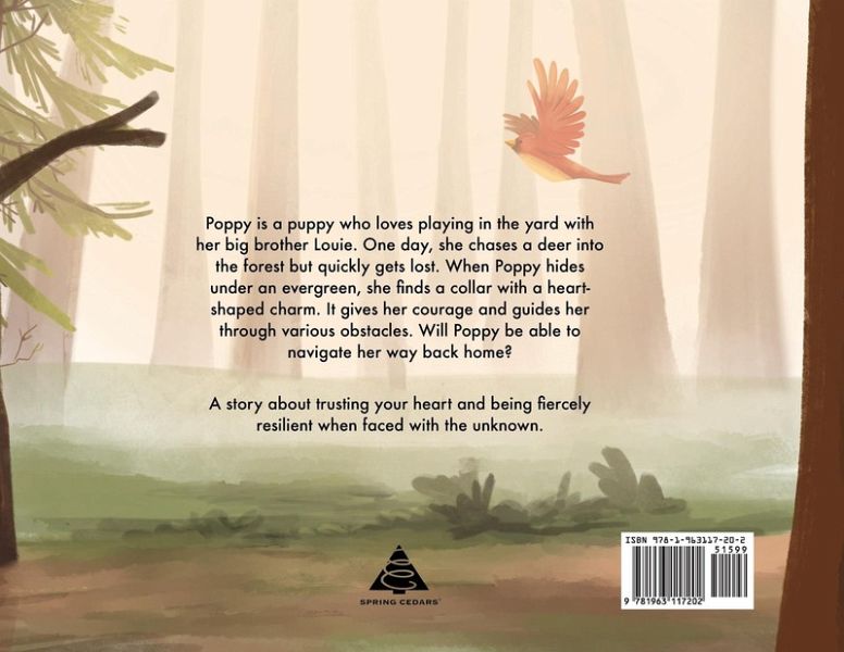 Poppy is a puppy who loves playing in the yard with her big brother Louie. One day, she chases a deer into the forest but quickly gets lost. When Poppy hides under an evergreen, she finds a collar with a heart-shaped charm. It gives her courage and guides her through various obstacles. Will Poppy be able to navigate her way back home? A story about trusting your heart and being fiercely resilient when faced with the unknown.