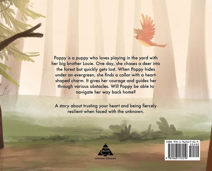 Poppy is a puppy who loves playing in the yard with her big brother Louie. One day, she chases a deer into the forest but quickly gets lost. When Poppy hides under an evergreen, she finds a collar with a heart-shaped charm. It gives her courage and guides her through various obstacles. Will Poppy be able to navigate her way back home? A story about trusting your heart and being fiercely resilient when faced with the unknown.