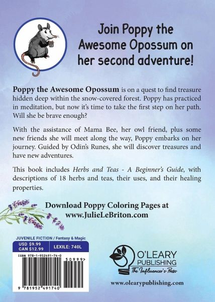 Poppy the Awesome Opossum is on a quest to find treasure hidden deep within the snow-covered forest. Poppy has practiced in meditation, but now it's time to take the first step on her path. Will she be brave enough? With the assistance of Mama Bee, her owl friend, plus some new friends she will meet along the way, Poppy embarks on her journey. Guided by Odin's Runes, she will discover treasures and experience new adventures. This book includes Herbs and Teas - A Beginner's Guide, about the benefits and healing powers of teas and herbs.
