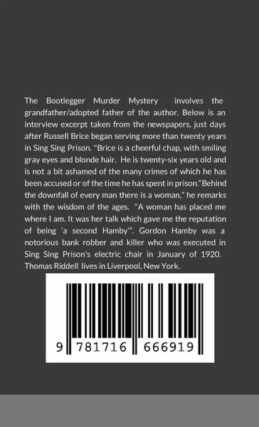 The Bootlegger Murder Mystery involves the grandfather/adopted father of the author. Below is an interview excerpt taken from the newspapers, just days after Russell Brice began serving more than twenty years in Sing Sing Prison. "Brice is a cheerful chap, with smiling gray eyes and blonde hair. He is twenty-six years old and is not a bit ashamed of the many crimes of which he has been accused or of the time he has spent in prison."Behind the downfall of every man there is a woman," he remarks with the wisdom of the ages. "A woman has placed me where I am. It was her talk which gave me the reputation of being 'a second Hamby'". Gordon Hamby was a notorious bank robber and killer who was executed in Sing Sing Prison's electric chair in January of 1920. Thomas Riddell lives in Liverpool, New York.