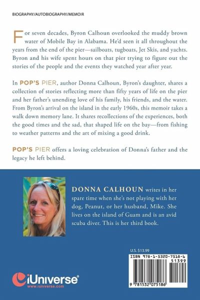 For seven decades, Byron Calhoun overlooked the muddy brown water of Mobile Bay in Alabama. He'd seen it all throughout the years from the end of the pier-sailboats, tugboats, Jet Skis, and yachts. Byron and his wife spent hours on that pier trying to figure out the stories of the people and the events they watched year after year. In Pop's Pier, author Donna Calhoun, Byron's daughter, shares a collection of stories reflecting more than fifty years of life on the pier and her father's unending love of his family, his friends, and the water. From Byron's arrival on the island in the early 1960s, this memoir takes a walk down memory lane. It shares recollections of the experiences, both the good times and the sad, that shaped life on the bay-from fishing to weather patterns and the art of mixing a good drink. Pop's Pier offers a loving celebration of Donna's father and the legacy he left behind.