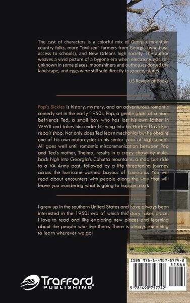 Pop's Sickles is history, mystery, and an adventurous romantic comedy set in the early 1950s. Pop, a gentle giant of a man, befriends Ted, a small boy who has lost his own father in WWII and takes him under his wing into his Harley Davidson repair shop. Not only does Ted learn mechanics but he obtains one of his own motorcycles in his senior year of high school. All goes well until romantic miscommunication between Pop and Ted's mother, Thelma, results in a crazy chase by mule- back high into Georgia's Cohutta mountains, a mad bus ride to a VA Army post, followed by a life threatening journey across the hurricane-washed bayous of Louisiana. You will read about encounters with people along the way that will leave you wondering what is going to happen next.
