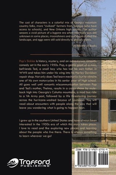 Pop's Sickles is history, mystery, and an adventurous romantic comedy set in the early 1950s. Pop, a gentle giant of a man, befriends Ted, a small boy who has lost his own father in WWII and takes him under his wing into his Harley Davidson repair shop. Not only does Ted learn mechanics but he obtains one of his own motorcycles in his senior year of high school. All goes well until romantic miscommunication between Pop and Ted's mother, Thelma, results in a crazy chase by mule- back high into Georgia's Cohutta mountains, a mad bus ride to a VA Army post, followed by a life threatening journey across the hurricane-washed bayous of Louisiana. You will read about encounters with people along the way that will leave you wondering what is going to happen next.
