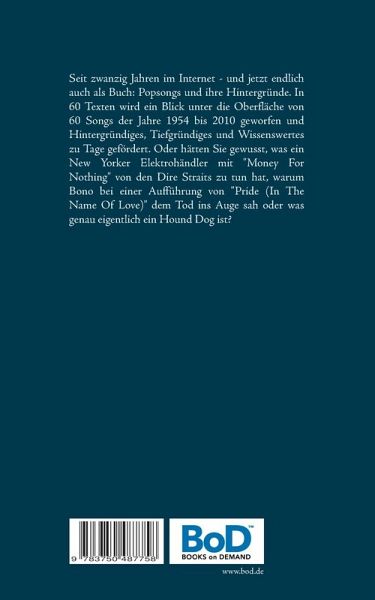 Seit zwanzig Jahren im Internet - und jetzt endlich auch als Buch: Popsongs und ihre Hintergründe. In 60 Texten wird ein Blick unter die Oberfläche von 60 Songs der Jahre 1954 bis 2010 geworfen und Hintergründiges, Tiefgründiges und Wissenswertes zu Tage gefördert. Oder hätten Sie gewusst, was ein New Yorker Elektrohändler mit "Money For Nothing" von den Dire Straits zu tun hat, warum Bono bei einer Aufführung von "Pride (In The Name Of Love)" dem Tod ins Auge sah oder was genau eigentlich ein "Hound Dog" ist?