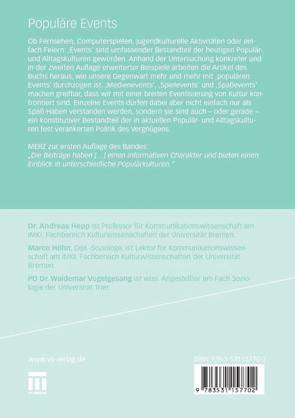 Ob Fernsehen, Computerspiele, jugendkulturelle Aktivitäten oder einfach Feiern: ,Events' sind umfassender Bestandteil der heutigen Populär- und Alltagskulturen geworden. Anhand der Untersuchung konkreter und in der zweiten Auflage erweiterter Beispiele arbeiten die Artikel des Buchs heraus, wie unsere Gegenwart mehr und mehr mit ,populären Events' durchzogen ist. ,Medienevents', ,Spielevents' und ,Spaßevents' machen greifbar, dass wir mit einer breiten Eventisierung von Kultur konfrontiert sind. Einzelne Events dürfen dabei aber nicht einfach nur als Spaß-Haben verstanden werden, sondern sie sind auch - oder gerade - ein konstitutiver Bestandteil der in aktuellen Populär- und Alltagskulturen fest verankerten Politik des Vergnügens.