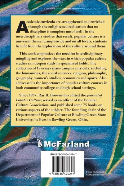 Academic curricula are being strengthened and enriched through the enlightened realization that no discipline is complete unto itself. In the interdisciplinary studies that result, the one theme that remains universal is popular culture. Academia throughout the disciplines is rapidly coming to understand that it should be used in courses campus-wide and on all levels. All in the world of education benefit from the use of the cultures around them. This work emphasizes the need for interdisciplinary mingling and explores the ways in which instructors can utilize popular culture studies in order to deepen both their own areas of specialization and their students' appreciation of education. The collection of 18 essays spans campus curricula, including the humanities (English literature, American studies, folklore and popular culture), the social sciences (anthropology, history, sociology and communications), religion and philosophy, geography, women's studies, economics and sports. Also addressed is the importance of popular culture courses in both community colleges and high school settings.