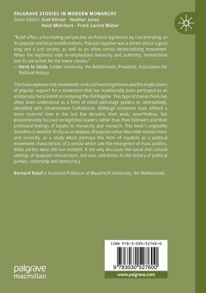 This book explores mid-nineteenth-century French legitimism and the implications of popular support for a movement that has traditionally been portrayed as an aristocratic force intent on restoring the Old Regime. This type of monarchism has often been understood as a form of elitist patronage politics or, alternatively, identified with ultramontane Catholicism. Although historians have offered a more nuanced view in the last few decades, their work, nevertheless, has predominantly focused on legitimist leaders rather than their followers and their professed feelings of loyalty to monarchy and monarch. This book's originality therefore is twofold: firstly as an analysis of popular rather than élite monarchism; and secondly, as a study which portrays this form of royalism as a political movement characteristic of a period which saw the emergence of mass politics, while parties were still non-existent. It not only discusses the social and cultural settings of (popular) monarchism, but also contributes to the history of political parties, citizenship and democracy.