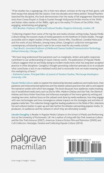 'We have long understood that paratexts such as marginalia, personal letters, and public responses contribute to our deeper understanding of classic works of literature. The publication of Popular Media Cultures suggests that we are finally doing to modern media texts what has long been accepted practice in other disciplines. Geraghty's thought provoking collection prompts us to re-evaluate what constitutes a text in our mediated world and to reconsider how we make meaning from this multiplicity of texts.' - Katherine Larsen, The George Washington University, Principal Editor of Journal of Fandom Studies