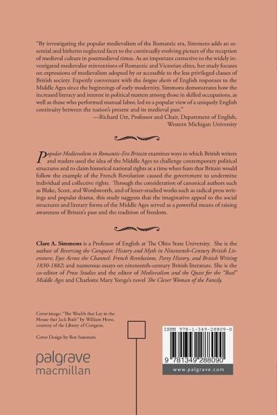 "Popular Medievalism in the Romantic-Era Britain brings an important perspective to bear on the Romantic rage for the past. Simmons notes that "medievalism," being a Victorian coinage, is usually discussed in the Victorian context and is usually conceived as in Ruskin, where the Romantic "zeitgeisty" notion of the three great "ages" of history takes a cultural and ethical turn to produce "Classicalism, Medievalism, and Modernism" ( 2). By going back to before Victorian medievalism and its obsession with duty, Simmons recovers other more "popular" ways of conceiving medieval period." - The Wordsworth Circle "Popular Medievalism in the Romantic-Era Britain's wide-ranging and meticulous analyses insist on the textuality not just of print sources but of structures, installations, and events. Simmons' uncovering of the connections among such disparate texts makes this a fascinating study. Her demonstration of the reach of populist discourse in the era-deliberate and otherwise-extends the work on Romantic radicalism and responses to it of Marcus Wood and Kevin Gilmartin.' - Kristin Samuelian "By investigating the popular medievalism of the Romantic era, Simmons adds an essential and hitherto neglected facet to the continually evolving picture of the reception of medieval culture in postmedieval times. As an important corrective to the widely investigated medievalist reinventions of Romantic and Victorian elites, her study focuses on expressions of medievalism adopted by or accessible to the less privileged classes of British society. Expertly conversant with the longue durée of English responses to the Middle Ages since the beginnings of early modernity, Simmons demonstrates how the increased literacy and interest in political matters among those in skilled occupations as well as those who performed manual labor led to a popular view of a uniquely English continuity between the nation's present and its medieval past." - Richard Utz, Professor and Chair, Department of English, Western Michigan University