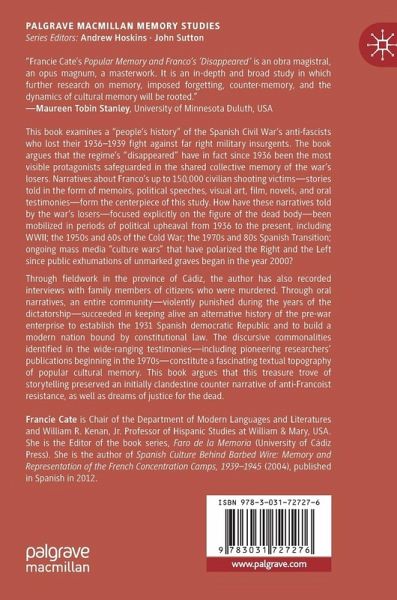 "Francie Cate's Popular Memory and Franco's 'Disappeared' is an obra magistral, an opus magnum, a masterwork. It is an in-depth and broad study in which further research on memory, imposed forgetting, counter-memory, and the dynamics of cultural memory will be rooted."