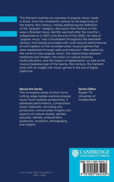This Element outlines an overview of popular music made in Brazil, from the nineteenth century to the beginning of the twenty-first century. Initially addressing the definition of the 'popular' category, discussion then follows on the ways a Brazilian music identity was built after the country's independence in 1822 until the end of the 1920s. An idea of 'popular music' was consolidated throughout the twentieth century, from being associated with rural musical performances of oral tradition to the recorded urban musical genres that were established through radio and television. After exploring the world of mass popular music, the relationships between traditional and modern, the topics of cultural diversity, multiculturalism, and the impact of digitalization, as well as the musical kaleidoscope of the twenty-first century, the Element ends with an insight into music genres in the era of digital platforms.