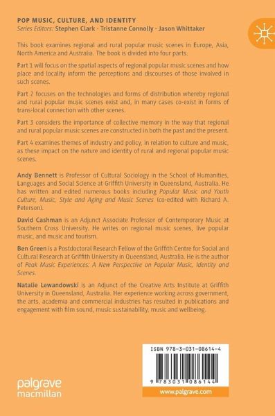 This book examines regional and rural popular music scenes in Europe, Asia, North America and Australia. The book is divided into four parts. Part 1 will focus on the spatial aspects of regional popular music scenes and how place and locality inform the perceptions and discourses of those involved in such scenes. Part 2 focuses on the technologies and forms of distribution whereby regional and rural popular music scenes exist and, in many cases co-exist in forms of trans-local connection with other scenes. Part 3 considers the importance of collective memory in the way that regional and rural popular music scenes are constructed in both the past and the present. Part 4 examines themes of industry and policy, in relation to culture and music, as these impact on the nature and identity of rural and regional popular music scenes.