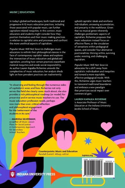 "In today's globalized landscapes, both traditional and progressive K-12 music education practices, including those associated with popular music, can further capitalism-related inequities. In this context, music educators and students might consider how they position themselves and their music-making practices in relation to capitalist aims and processes and confront the more unethical aspects of capitalism. Popular Music Will Not Save Us challenges music educators to rethink their philosophical stances in the face of contemporary capitalist values and explores the intersection of music education and globalized capitalism, unveiling how certain practices exacerbate material inequities and erode social responsibility. As author Lauren Kapalka Richerme unravels the complexities of music education, her analysis sheds light on how prevalent practices can inadvertently uphold capitalist ideals and reinforce individualism, unceasing accumulation, and precarity in the workforce. Given that no musical genre inherently challenges problematic aspects of capitalism, Richerme proposes that music educators instead focus on affective flows, or the circulation of sensations within pedagogical spaces, and consider four alternative positionalities: thriving within, surviving under, resisting, and challenging capitalism. Popular Music Will Not Save Us advocates for a shift away from capitalistic individualism and inequities and toward a more equitable, affective pedagogical mode. Now is the time to transcend traditional boundaries and embrace a new paradigm that prioritizes social impact over commercial gain"--