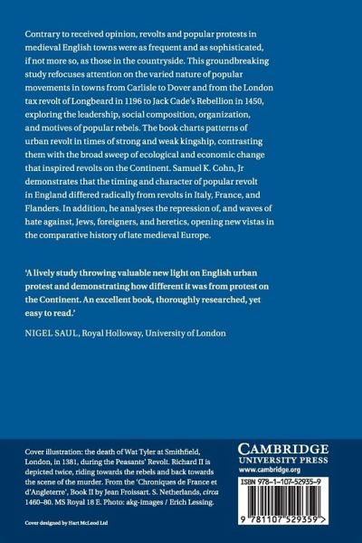 Contrary to received opinion, revolts and popular protests in medieval English towns were as frequent and as sophisticated, if not more so, as those in the countryside. This groundbreaking study refocuses attention on the varied nature of popular movements in towns from Carlisle to Dover and from the London tax revolt of Longbeard in 1196 to Jack Cade's Rebellion in 1450, exploring the leadership, social composition, organisation and motives of popular rebels. The book charts patterns of urban revolt in times of strong and weak kingship, contrasting them with the broad sweep of ecological and economic change that inspired revolts on the continent. Samuel Cohn demonstrates that the timing and character of popular revolt in England differed radically from revolts in Italy, France and Flanders. In addition, he analyses repression and waves of hate against Jews, foreigners and heretics, opening new vistas in the comparative history of late medieval Europe.