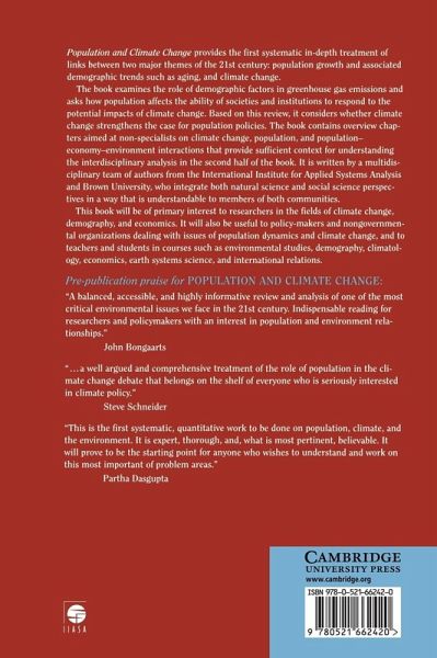 Population and Climate Change provides the first systematic in-depth treatment of links between two major themes of the twenty-first century: population growth and associated demographic trends such as aging, and climate change. It is written by a multidisciplinary team of authors from the International Institute for Applied Systems Analysis, who integrate both natural science and social science perspectives in a way that is readable by members of both communities. The book will be of primary interest to researchers in the fields of climate change, demography, and economics. It will also be useful to policy-makers and NGOs dealing with issues of population dynamics and climate change, and to teachers and students on courses such as environmental studies, demography, climatology, economics, earth systems science, and international relations.