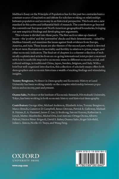 Malthus's Essay on the Principle of Population has for the past two centuries been a constant source of inspiration and debate for scholars working on relationships between population and economy in a historical perspective. This book sets a new standard in this active and influential field of research. The contributors go beyond the conventional European and North American geographical boundaries, bringing out new empirical findings and developing new arguments. The volume is divided into three parts. The first part takes up classical issues -- the 'positive' and the 'preventive' checks and their determinants -- raised by Malthus himself, and examines the issues against fresh evidence from Europe, America, and Asia. These issues are also themes of the second part, which is devoted to short-term fluctuations in mortality and fertility in relation to prices, wages, and other economic indicators. The final set of chapters is a coherent collection of technically sophisticated articles from an on-going international joint project concerned with how households respond to economic stress in different economic, social, and cultural settings, in traditional China, Japan, Sweden, Belgium, and Italy. With a brief, but well-organized introduction, this collection of scholarly essays offers both demographers and economic historians a wealth of exciting findings and stimulating insights.