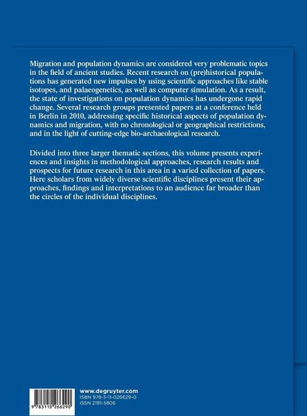 Migrations and population dynamics are considered very problematic topics in the fields of ancient studies. Recent scholarship in (pre)historical population has generated new impulses by using scientific approaches using radiogenic and stable isotopes, and palaeogenetics, as well as computer simulation. As a result, the state of migration research has undergone rapid change. Several research groups presented papers at a conference held in Berlin in 2010, addressing specific historical aspects of population dynamics and migration, with no chronological or geographical restrictions, in the light of cutting-edge bio-archaeological research. This volume, divided into three larger thematic sections (isotope analysis, population genetics, and modelling and computer simulation), presents experiences and insights about methodological approaches, research results and prospects for future research in this area in a varied collection of papers. Scholars from widely diverse scientific disciplines present their approaches, findings and interpretations to an audience far broader than the circles of the individual disciplines.