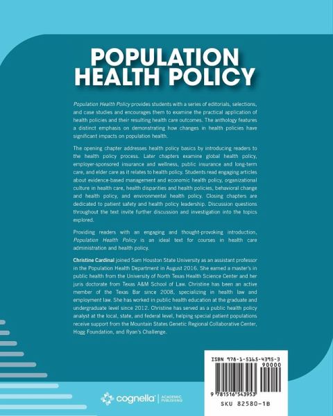 Population Health Policy provides students with a series of editorials, selections, and case studies and encourages them to examine the practical application of health policies and their resulting health care outcomes. The anthology features a distinct emphasis on demonstrating how changes in health policies have significant impacts on population health. The opening chapter addresses health policy basics by introducing readers to the health policy process. Later chapters examine global health policy, employer-sponsored insurance and wellness, public insurance and long-term care, and elder care as it relates to health policy. Students read engaging articles about evidence-based management and economic health policy, organizational culture in health care, health disparities and health policies, behavioral change and health policy, and environmental health policy. Closing chapters are dedicated to patient safety and health policy leadership. Discussion questions throughout the text invite further discussion and investigation into the topics explored. Providing readers with an engaging and thought-provoking introduction, Population Health Policy is an ideal text for courses in health care administration and health policy. Christine Cardinal joined Sam Houston State University as an assistant professor in the Population Health Department in August 2016. She earned a master's in public health from the University of North Texas Health Science Center and her juris doctorate from Texas A&M School of Law. Christine has been an active member of the Texas Bar since 2008, specializing in health law and employment law. She has worked in public health education at the graduate and undergraduate level since 2012. Christine has served as a public health policy analyst at the local, state, and federal level, helping special patient populations receive support from the Mountain States Genetic Regional Collaborative Center, Hogg Foundation, and Ryan's Challenge.