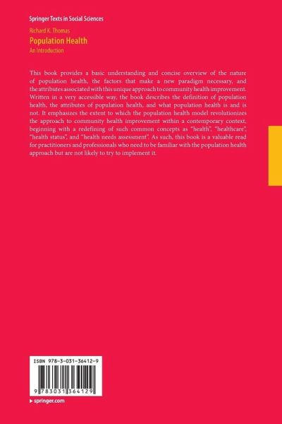 Chapter 1. Defining Population Health.- Chapter 2. The Road to Population Health: A Changing Society.- Chapter 3. The Road to Population Health: A Changing Healthcare System.- Chapter 4. Health Status and How to Measure It.- Chapter 5. The Social Determinants of Health and Illness.- Chapter 6. Persisting Health Disparities.- Chapter 7. Population Health and Healthcare Delivery.- Chapter 8. Population Health and Public Policy.- Chapter 9. Traditional Approaches to Community Health Data.- Chapter 10. Data Needs for the Population Health Model.- Chapter 11. The Role of the Community in Population Health Improvement.