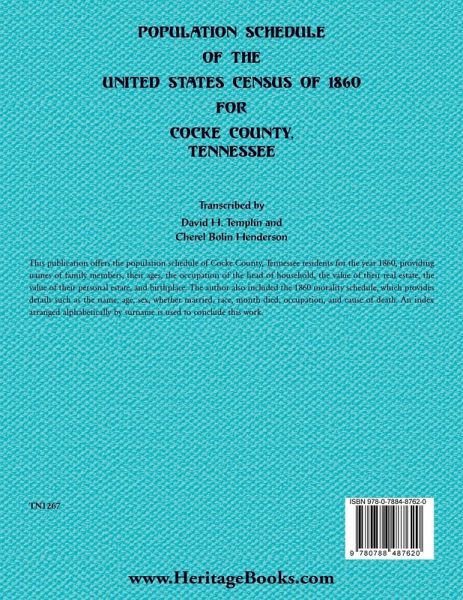This publication offers the population schedule of Cocke County, Tennessee residents for the year 1860, providing names of family members, their ages, the occupation of the head of household, the value of their real estate, the value of their personal estate, and birthplace. The author also included the 1860 morality schedule, which provides details such as the name, age, sex, whether married, race, month died, occupation, and cause of death. An index arranged alphabetically by surname is used to conclude this work.