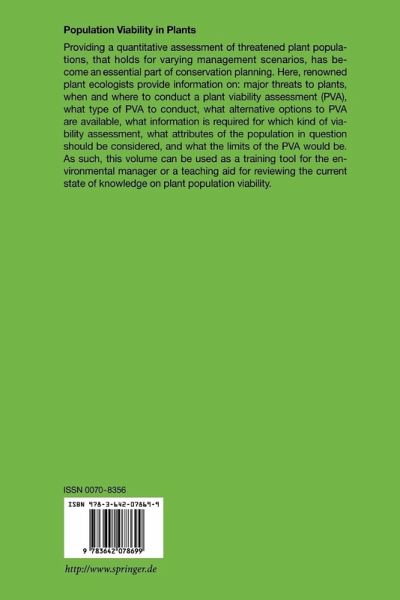 Providing a quantitative assessment of threatened plant populations, that holds for varying management scenarios, has become an essential part of conservation planning. Here, renowned plant ecologists provide information on: major threats to plants, when and where to conduct a plant viability assessment (PVA), what type of PVA to conduct, what alternative options to PVA are available, what information is required for which kind of viability assessment, what attributes of the population in question should be considered, and what the limits of the PVA would be. As such, this volume can be used as a training tool for the environmental manager or a teaching aid for reviewing the current state of knowledge on plant population viability.