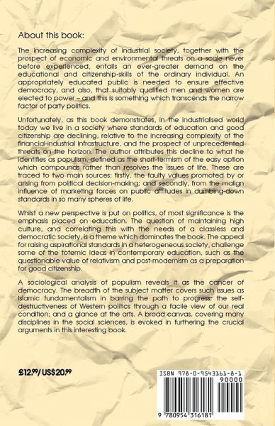 A sociological study of populism as a major influence in undermining standards in many spheres of life, through false values promoted either through or resulting from political activity, etc., or through corporate marketing forces. The book is of particular relevance to educationalists with regard to its criticism of relativism and post-modernism.