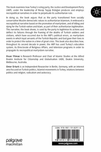 In doing so, the book argues that as the party transitioned from socially conservative Muslim democratic values to authoritarian Islamism, it embraced a necropolitical narrative based on the promotion of martyrdom, and of killing and dying for the Turkish nation and Islam, as part of their authoritarian legitimation. This narrative, the book shows, is used by the party to legitimise its actions and deflect its failures through the framing of the deaths of Turkish soldiers and civilians, which have occurred due to the AKP's political errors, as martyrdom events in which loyal servants of the Turkish Republic and God gave their lives in order to protect the nation in a time of great crisis. This book also describes how, throughout its second decade in power, the AKP has used Turkey's education system, its Directorate of Religious Affairs, and television programs in order to propagate its necropolitical martyrdom narrative.