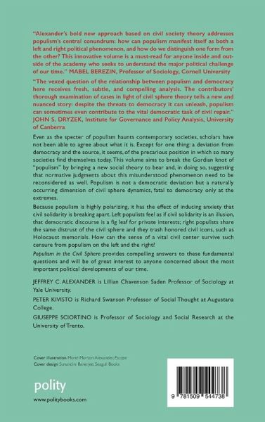 "Jeffrey Alexander and his collaborators have brought sociological insights drawn from political and social theory to bear on the study of populism. Alexander's bold new approach based on civil society theory addresses populism's central conundrum. How can populism manifest itself as both a left and right political phenomenon and how do we distinguish one form from the other? Populism and the Civil Sphere argues that a vibrant democracy depends on social solidarities that develop within a bounded public space of civic discourse. Within the civil sphere, politics can veer to the left or right--the radical to the conservative--without seriously threatening democracy. It is only when the center does not hold then extremism on left and right becomes a possibility. The seventeen exciting and theoretically linked case studies in this cogent and coherent anthology span the globe as they explore left and right variants of populism. This innovative collection is a must read for anyone inside and outside of the academy who seeks to understand the major political challenge of our time."