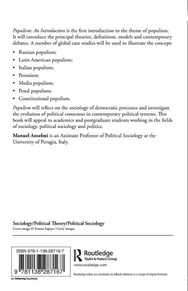Populism is the first introduction to the theme of populism. It will introduce the principal theories, definitions, models and contemporary debates. A number of global case studies (Russian populism, Latin American populism and Italian populism) will be used to illustrate the concept. Populism: An Introduction will reflect on the sociology of democratic processes and investigate the evolution of political consensus in contemporary political systems.