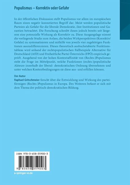 In der öffentlichen Diskussion stellt Populismus vor allem im europäischen Raum einen negativ konnotierten Begriff dar. Meist werden populistische Parteien als Gefahr für die liberale Demokratie, ihre Institutionen und Garantien betrachtet. Die Forschung schreibt ihnen jedoch bereits seit längerem eine potenzielle Wirkung als Korrektiv zu. Diese Ausgangslage nimmt die vorliegende Studie zum Anlass, die beiden Wirkperspektiven (Korrektiv/Gefahr) zu systematisieren und mithilfe von jeweils vier zugehörigen Funktionen auszudifferenzieren. Dieses theoretisch ausbuchstabierte Funktionstableau wird anhand der rechtspopulistischen Fallbeispiele Alternative für Deutschland (AfD) und Freiheitliche Partei Österreichs (FPÖ) empirisch geprüft. Ausgehend von der hohen Kontextaffinität von (Rechts-)Populismus steht die Frage im Mittelpunkt, welche Funktionen (rechts-)populistische Akteure innerhalb der liberal-demokratischen Ordnung übernehmen und unter welchen Kontextbedingungen sie dieseaus- und erfüllen können.