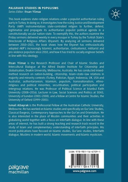 This book explores state-religion relations under a populist authoritarian ruling party in Turkey. In doing so, it investigates how the ruling Justice and Development Party (AKP) instrumentalizes state-controlled religion to further, defend, legitimatize and propagate its authoritarian populist political agenda in a constitutionally secular nation-state. To exemplify this, the authors examine the Friday sermons delivered weekly in every mosque in Turkey by the Turkish State's Directorate of Religious Affairs (Diyanet). By analyzing all sermons delivered between 2010-2021, the book shows how the Diyanet has enthusiastically adopted AKP's increasingly Islamist, authoritarian, civilisationist, militarist and pro-violence populism since 2010, and how it has tried to socially engineer beliefs in line with this ideology.