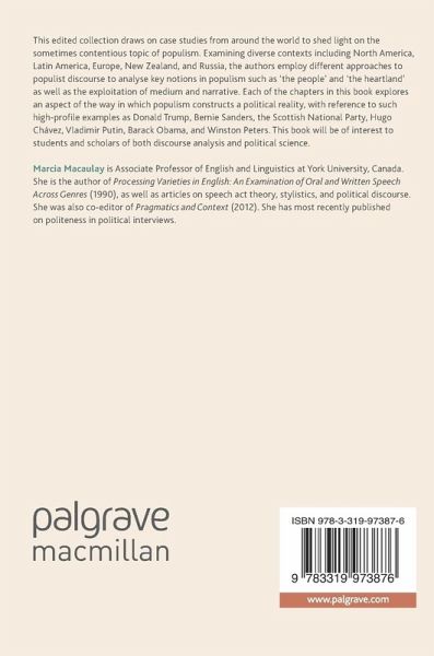 This edited collection draws on case studies from around the world to shed light on the sometimes contentious topic of populism. Examining diverse contexts including North America, Latin America, Europe, New Zealand, and Russia, the authors employ different approaches to populist discourse to analyse key notions in populism such as 'the people' and 'the heartland' as well as the exploitation of medium and narrative. Each of the chapters in this book explores an aspect of the way in which populism constructs a political reality, with reference to such high-profile examples as Donald Trump, Bernie Sanders, the Scottish National Party, Hugo Chávez, Vladimir Putin, Barack Obama, and Winston Peters. This book will be of interest to students and scholars of both discourse analysis and political science.