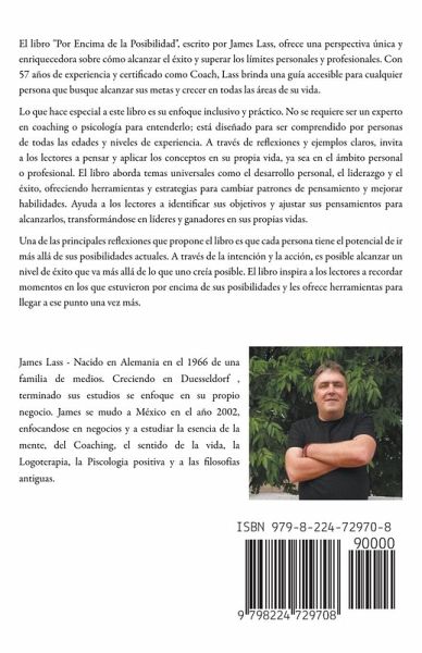 El libro "Por Encima de la Posibilidad", escrito por James Lass, ofrece una perspectiva única y enriquecedora sobre cómo alcanzar el éxito y superar los límites personales y profesionales. Con 57 años de experiencia y certificado como Coach, Lass brinda una guía accesible para cualquier persona que busque alcanzar sus metas y crecer en todas las áreas de su vida. Lo que hace especial a este libro es su enfoque inclusivo y práctico. No se requiere ser un experto en coaching o psicología para entenderlo; está diseñado para ser comprendido por personas de todas las edades y niveles de experiencia. A través de reflexiones y ejemplos claros, invita a los lectores a pensar y aplicar los conceptos en su propia vida, ya sea en el ámbito personal o profesional. El libro aborda temas universales como el desarrollo personal, el liderazgo y el éxito, ofreciendo herramientas y estrategias para cambiar patrones de pensamiento y mejorar habilidades. Ayuda a los lectores a identificar sus objetivos y ajustar sus pensamientos para alcanzarlos, transformándose en líderes y ganadores en sus propias vidas. Una de las principales reflexiones que propone el libro es que cada persona tiene el potencial de ir más allá de sus posibilidades actuales. A través de la intención y la acción, es posible alcanzar un nivel de éxito que va más allá de lo que uno creía posible. El libro inspira a los lectores a recordar momentos en los que estuvieron por encima de sus posibilidades y les ofrece herramientas para llegar a ese punto una vez más. En resumen, "Por Encima de la Posibilidad" es una lectura motivadora y transformadora que guía a los lectores hacia un camino de crecimiento personal y profesional. Con la sabiduría y experiencia de James Lass, este libro ofrece un mapa claro para alcanzar el éxito y superar los límites en todas las áreas de la vida.