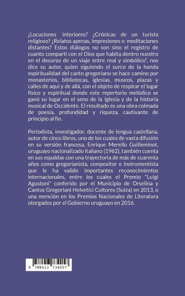 "¿Locuciones interiores? ¿Crónicas de un turista religioso? ¿Relatos apenas, impresiones o meditaciones distantes? Estos diálogos no son sino el registro de cuanto compartí con el Dios que habita dentro nuestro en el decurso de un viaje entre real y simbólico", nos dice su autor, quien siguiendo el surco de la honda espiritualidad del canto gregoriano se hace camino por monasterios,, bibliotecas, iglesias, museos, plazas y calles de aquí y de allá, con el objeto de respirar el lugar físico y espiritual donde este repertorio melódico se ganó su lugar en el seno de la Iglesia y de la historia musical de Occidente. El resultado es una obra colmada de poesía, profundidad y riqueza, cautivante de principio al fin.