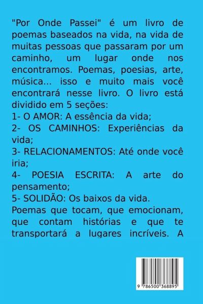 Por Onde Passei é um livro de poemas baseado na vida, na vida de muitas pessoas que passaram por um caminho, um lugar onde nos encontramos. Poemas, po