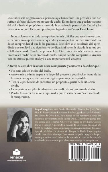 Este libro será de gran ayuda a personas que han tenido una pérdida y que han sufrido altibajos durante su proceso de duelo. Es mi deseo que puedan transitar del dolor hacia el propósito a través de la experiencia personal de Raquel y las herramientas que ella ha recopilado para lograrlo. -Pastor Cash Luna Indudablemente, una de las experiencias más difíciles que atravesamos como seres humanos es perder a un ser querido, y solo aquellos que han atravesado ese dolor comprenden al que lo ha padecido. Este libro es el resultado del aprendizaje que conllevó una significativa pérdida familiar en la vida de la autora con el fallecimiento de Camila, su primera hija. Cinco años después de este acontecimiento, en medio de su proceso de duelo, Raquel decidió compartir su vivencia con los otros a quienes incluyó a una importante red de apoyo. A través de este libro la autora desea acompañarte y animarte a descubrir que: No estás solo en medio del duelo. Atravesarás distintas etapas a lo largo del proceso y podrá echar mano de las herramientas que aparecen estas páginas para superar la pérdida. Tienes la posibilidad de encontrar un propósito a partir de la situación vivida. La empatía es un pilar fundamental en medio de los procesos de duelo. Puedes fortalecer los valores espirituales que te serán de sostén en medio de la recuperación. Raquel Vargas nació el 26 de febrero de 1980 en San José, Costa Rica. Es Licenciada en Relaciones Públicas, graduada de la Universidad Latina de Costa Rica. Es la menor de tres hermanos y junto con su familia es voluntaria en la Iglesia Oasis. Desde hace quince años está casada con Jonathan Chaves y es madre de tres hijos, Camila, Tomás y Leonor. A partir de la muerte de su primera hija en el año 2010, ha podido ayudar a muchas personas que atraviesan diferentes tipos de pérdidas. Es pionera del Grupo de Duelo Hope, equipo creado hace cinco años que tiene como propósito apoyar a las personas que enfrentan el dolor de la ausencia a través de la empatía, brindando herramientas para el correcto manejo de este proceso.