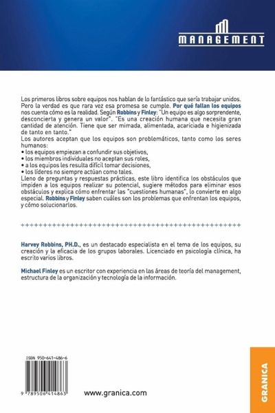 Los primeros libros sobre equipos nos hablan de lo fantástico que sería trabajar unidos. Pero la verdad es que rara vez esa promesa se cumple. Por qué fallan los equipos nos cuenta cómo es la realidad. Según Robbins y Finley: "Un equipo es algo sorprendente, desconcierta y genera un valor". "Es una creación humana que necesita gran cantidad de atención. Tiene que ser mimada, alimentada, acariciada e higienizada de tanto en tanto". Los autores aceptan que los equipos son problemáticos, tanto como los seres humanos: los equipo empiezan a confundir sus objetivos, los miembros individuales no aceptan sus roles, a los equipos les resulta difícil tomar decisiones, los líderes no siempre actúan como tales. Lleno de preguntas y respuestas prácticas, este libro identifica los obstáculos que impiden a los equipos realizar su potencial, sugiere métodos para eliminar esos obstáculos y explica cómo enfrentar las "cuestiones humanas", eso lo enfrentan los equipos, y cómo solucionarlos Harvey Robbins, PH.D., es un destacado especialista en el tema de los equipos, su creación y la eficacia de los grupos laborales. Licenciado en psicología clínica, ha escrito varios libros. Michael Finley es un escritor con experiencia en las áreas de teoría del management, estructura de la organización y tecnológía de la información.