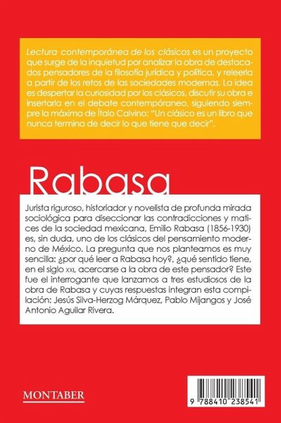 Jurista riguroso, historiador y novelista de profunda mirada sociológica para diseccionar las contradicciones y matices de la sociedad mexicana, Emilio Rabasa (1856-1930) es, sin duda, uno de los clásicos del pensamiento moderno de México. La pregunta que nos planteamos es muy sencilla: ¿por qué leer a Rabasa hoy?, ¿Qué sentido tiene, en el siglo XXI, acercarse a la obra de este pensador? Este fue el interrogante que lanzamos a tres agudos estudiosos de la obra de Rabasa y cuyas respuestas integran esta compilación: Jesús Silva-Herzog Márquez, Pablo Mijangos y José Antonio Aguilar Rivera.
